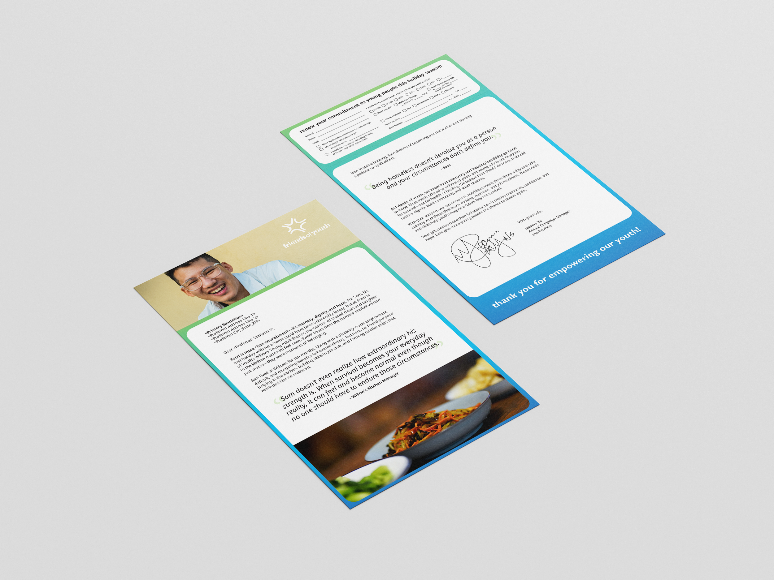 I worked directly with Friends of Youth’s Development team and our print vendor to create these donor appeals that were mailed out to the community. They were designed so that donors could tear off the bottom section and send it back to us with their information.